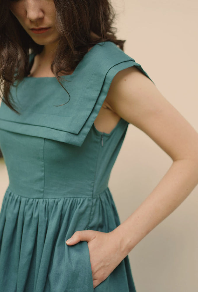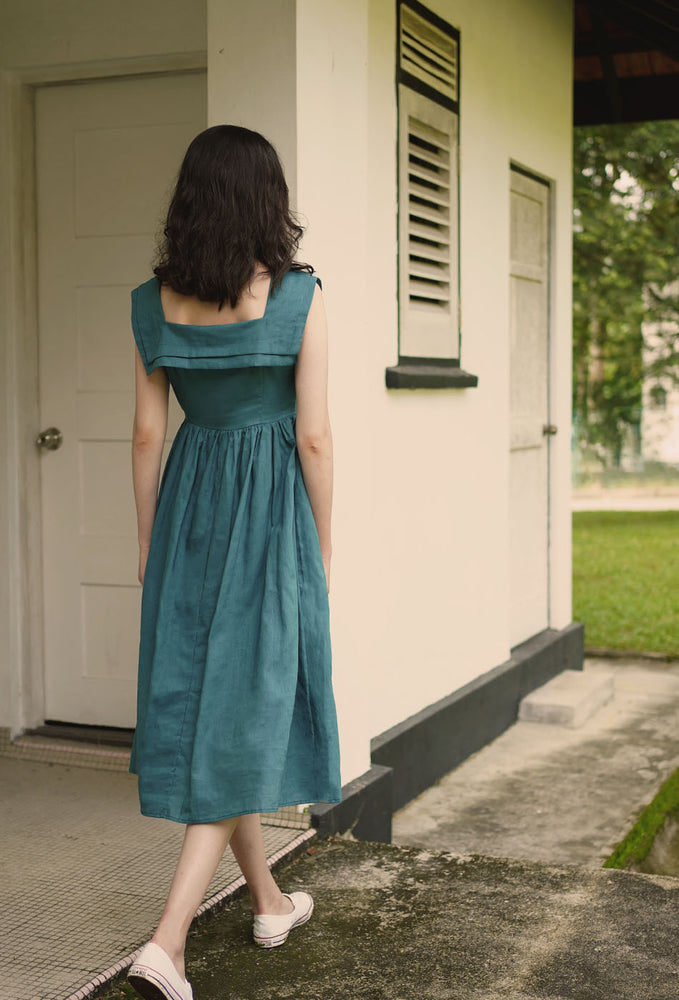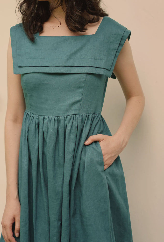 Inspired by a 1940s dress pattern with a square neck sailor collar - imagine putting this charming piece on for weekend lunches at Grandma’s. Comes with a flattering A-line skirt that enhances the waist and side zip closure. In two beautiful colors – pink and dark cyan. Made with linen cotton blend fabric and comes with side pockets. Garment is fully lined in 100% cotton. Designed for a slim fit at bust, slightly loose from the waist down and in midi length. Dresses perfectly with your favorite flats.