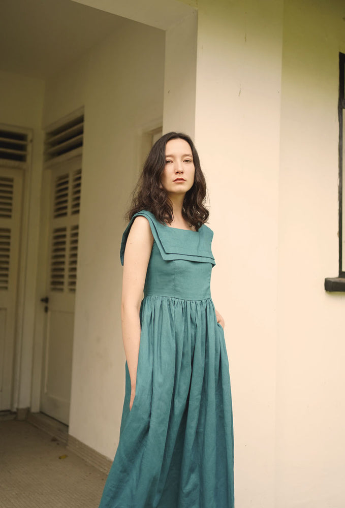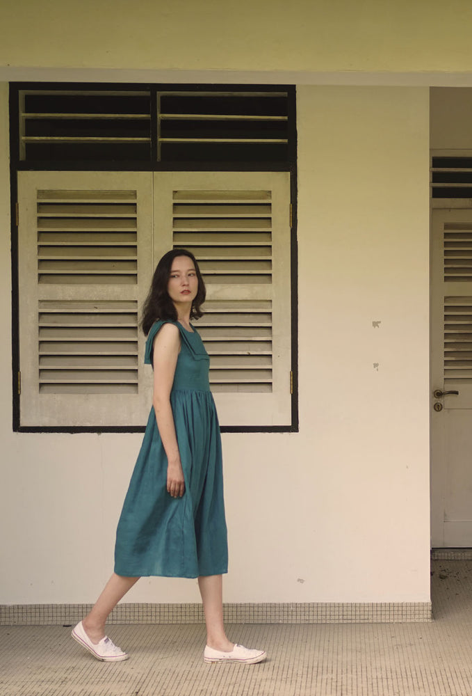 Regular price RM343.00 MYRInspired by a 1940s dress pattern with a square neck sailor collar - imagine putting this charming piece on for weekend lunches at Grandma’s. Comes with a flattering A-line skirt that enhances the waist and side zip closure. In two beautiful colors – pink and dark cyan. Made with linen cotton blend fabric and comes with side pockets. Garment is fully lined in 100% cotton. Designed for a slim fit at bust, slightly loose from the waist down and in midi length. Dresses perfectly with your favorite flats.