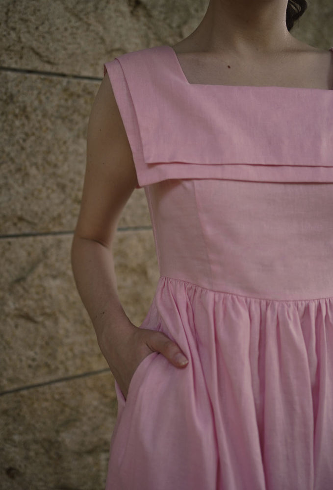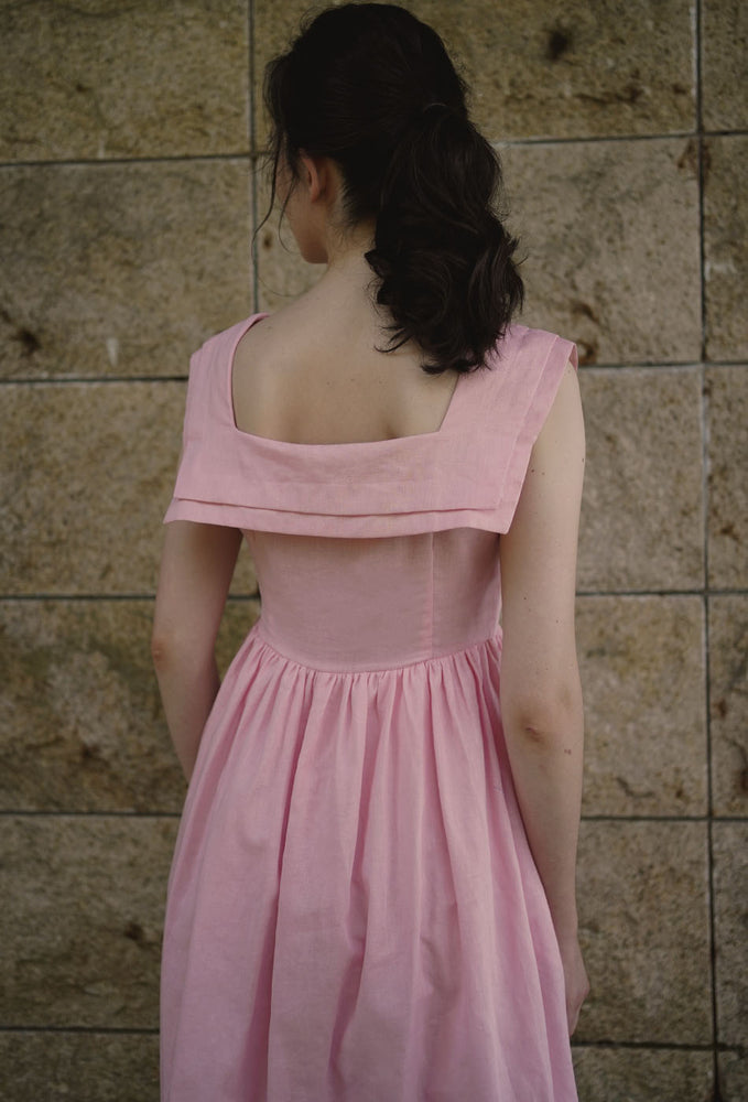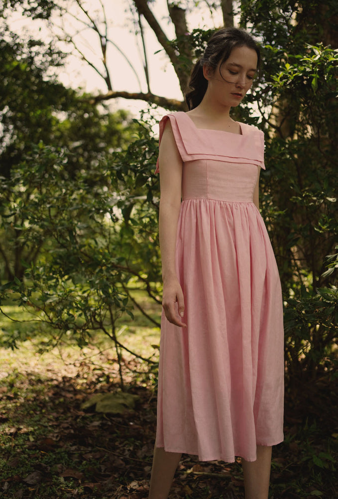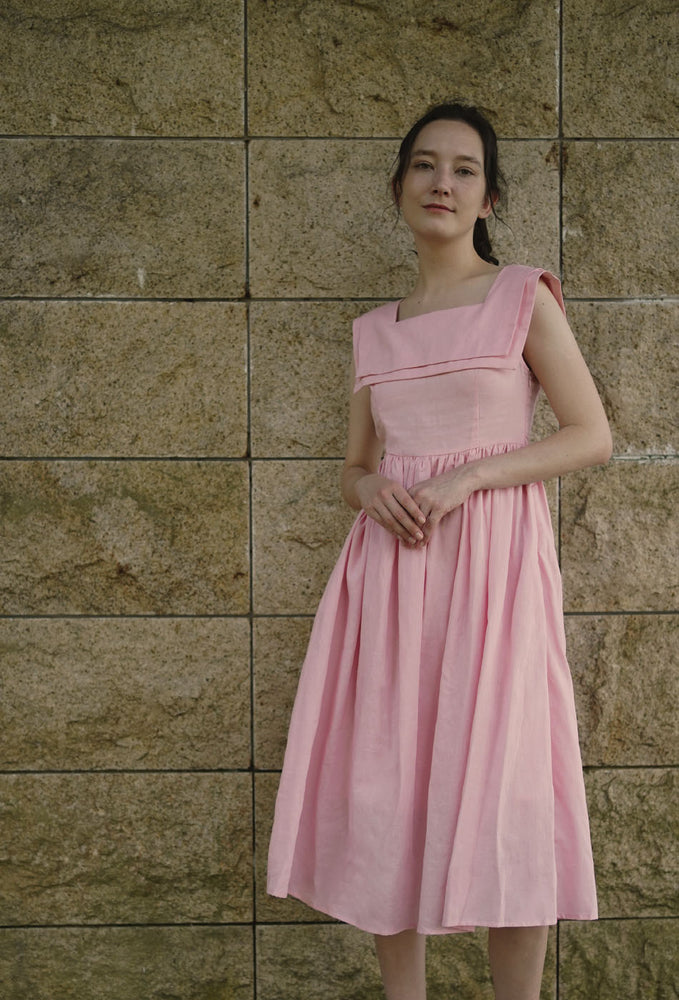 Inspired by a 1940s dress pattern with a square neck sailor collar - imagine putting this charming piece on for weekend lunches at Grandma’s. Comes with a flattering A-line skirt that enhances the waist and side zip closure. In two beautiful colors – pink and dark cyan. Made with linen cotton blend fabric and comes with side pockets. Garment is fully lined in 100% cotton. Designed for a slim fit at bust, slightly loose from the waist down and in midi length. Dresses perfectly with your favorite flats.